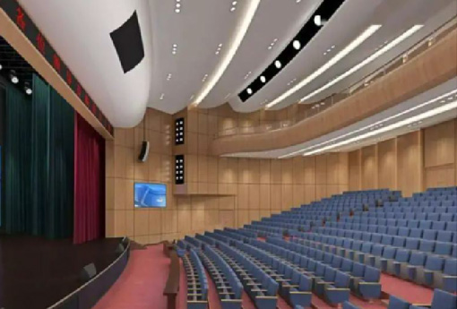 剧场主扩声系统采用左、中、右三个通道,三个声道全场覆盖,扬声器为全频和超低频组合的形式,能够达到立体声还音效果;设置声像音箱,用以解决声像的下拉定位;乐池与台唇设置补声音箱。主舞台设置固定返送音箱,除了常规的固定安装扬声器系统外,舞台面还设置了流动返送扩声系统。剧场内设置了完备的电影扬声器系统,可以实现7.1声道电影效果声还音。